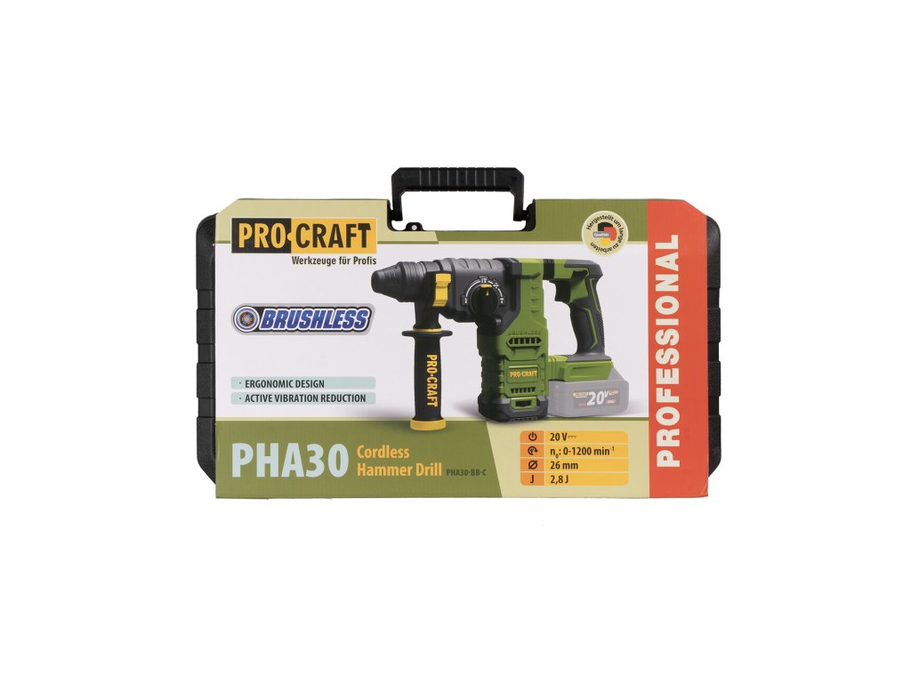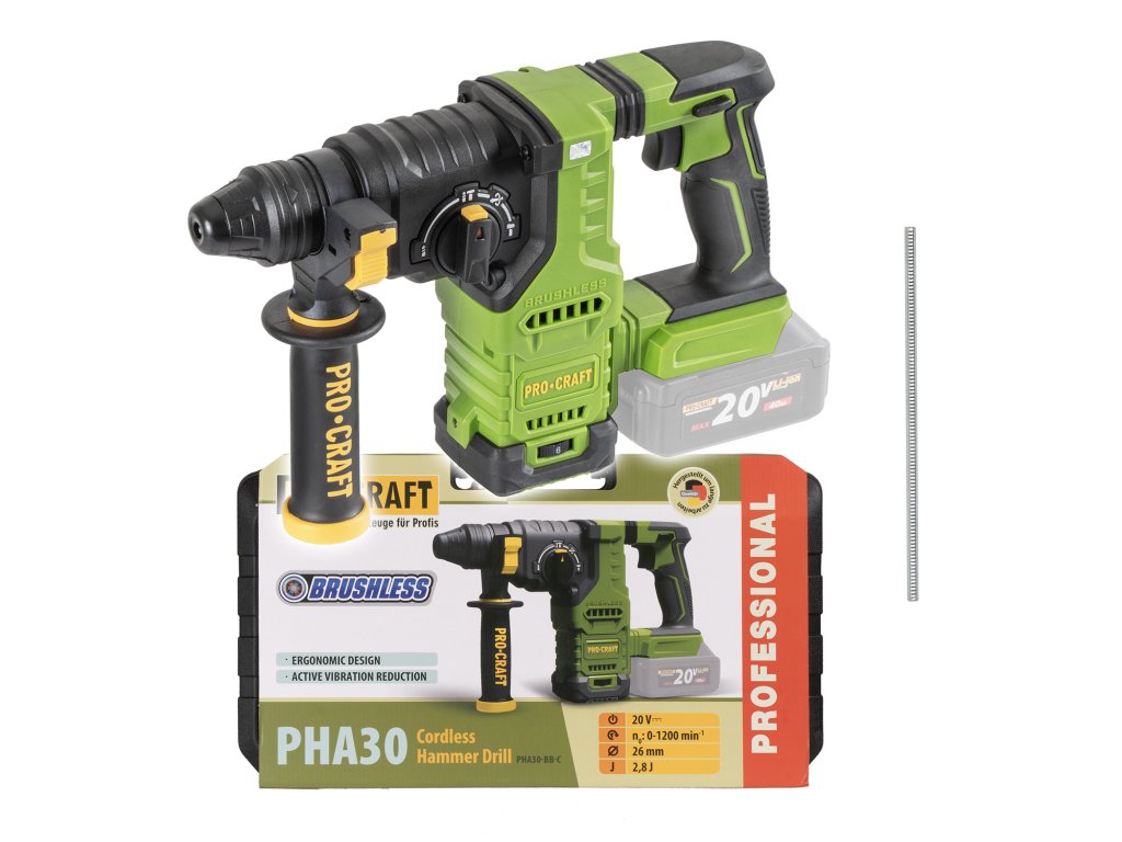 Aku vŕtacie kladivo Procraft PHA30bb-k je univerzálne a výkonné náradie navrhnuté pre profesionálne aj domáce použitie. Vďaka bezuhlíkovému motoru, režimom vŕtania, vŕtania s príklepom a sekania je ideálne na prácu s tvrdými materiálmi, ako je betón, murivo alebo kameň.