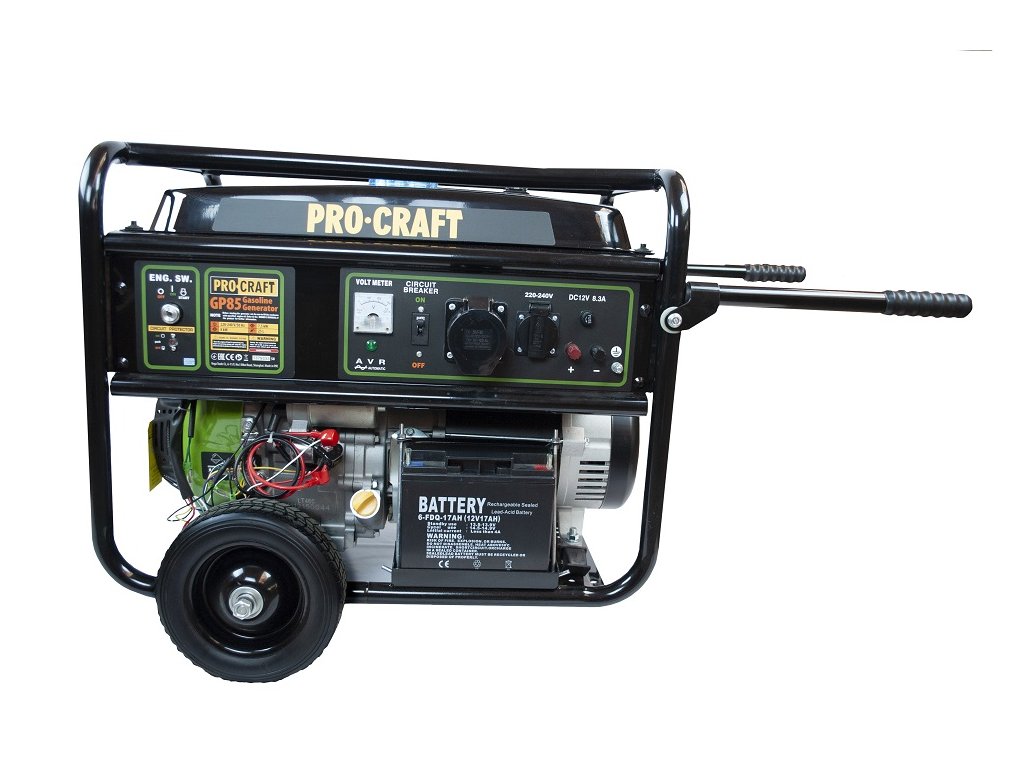 Elektrický generátor Procraft GP85 je určený na použitie ako nezávislý generátor energie pri výpadkoch elektrického prúdu, ako zdroj energie v stavebníctve, v domácnosti, kde nie je k dispozícii elektrická sieť. Vďaka vysokému výkonu dokáže napájať nielen domáce spotrebiče, ale aj spotrebiče indukčného typu. Generátor elektrickej energie má 25 l palivovú nádrž, ktorá zaručuje dlhú nepretržitú prevádzku. Elektronický štart zabezpečuje rýchle naštartovanie benzínového motora. Robustný ochranný rám umožňuje používanie elektrocentrály v akýchkoľvek podmienkach a uľahčuje aj jej prepravu. Súčasťou dodávky je elektrická zástrčka, 2 rukoväte, 2 kolieska, kľúč na zapaľovaciu sviečku. Balenie v kartóne. Prepäťová ochrana AVR.