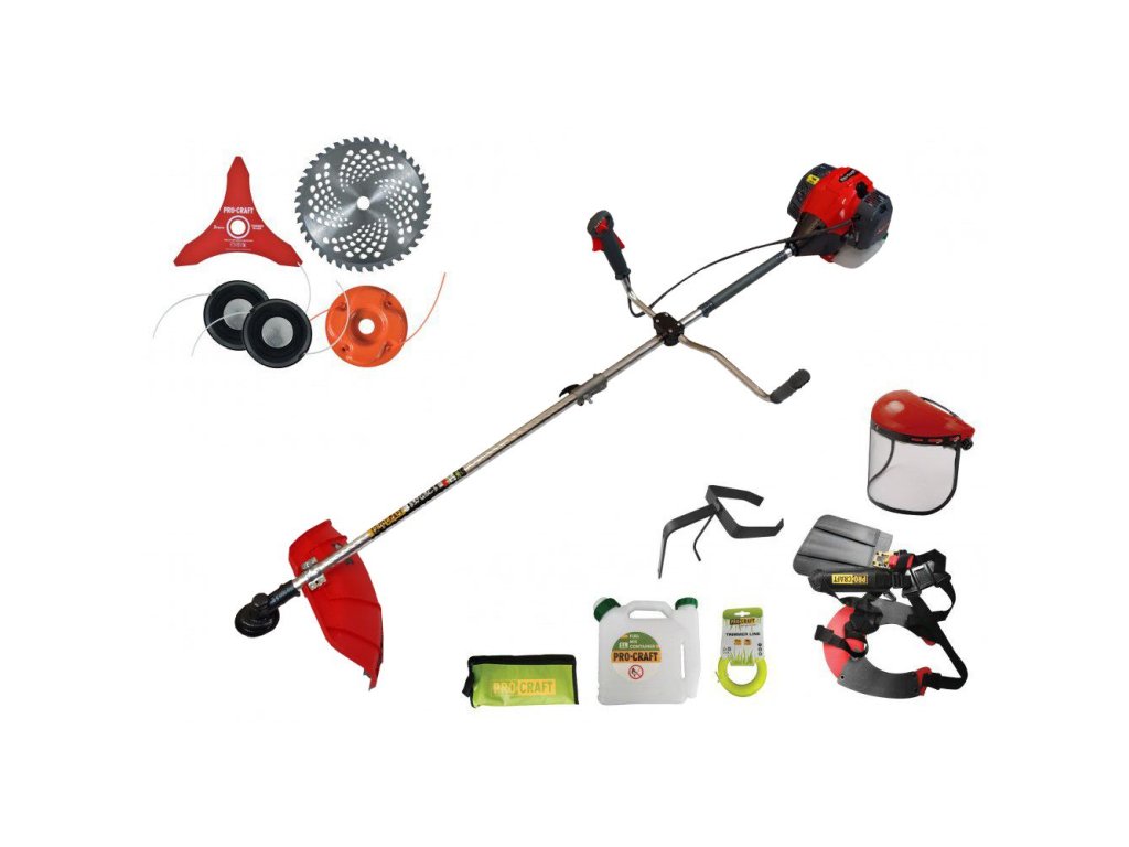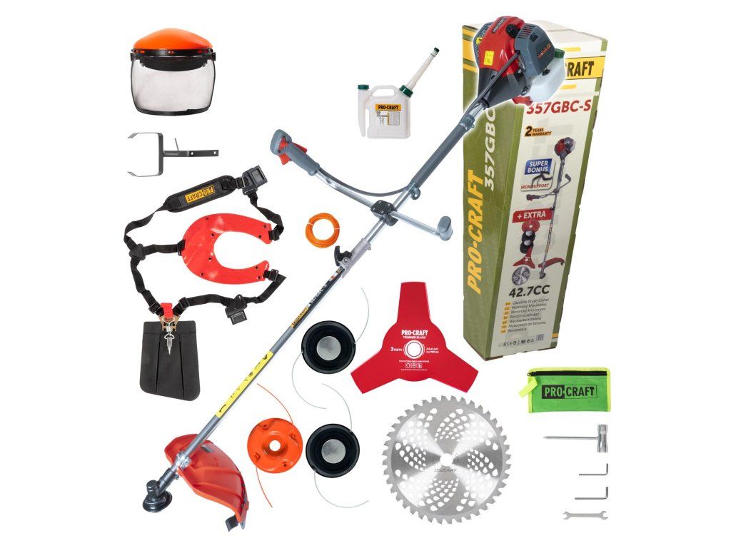 Benzínový krovinorez Procraft 357GBC je určený na kosenie a vyžínanie trávnikov, odstraňovanie drobných drevín s priemerom do 1,5 cm. Ovládanie vyhadzovania struny je poloautomatické. Súčasťou dodávky je 3x strunová hlava s kovovým dnom, pílový kotúč na drevo, 3-zubý kotúč, ochranná maska, rezná struna, nádoba na miešanie paliva, dvojitý popruh a sada kľúčov. Lišta s priemerom 28 mm a 9. hviezda zabezpečujú dlhšiu životnosť prevodovky. Predpísaná zmes oleja a benzínu je 1:40 (1:25 pri zábere) Kartónové balenie.