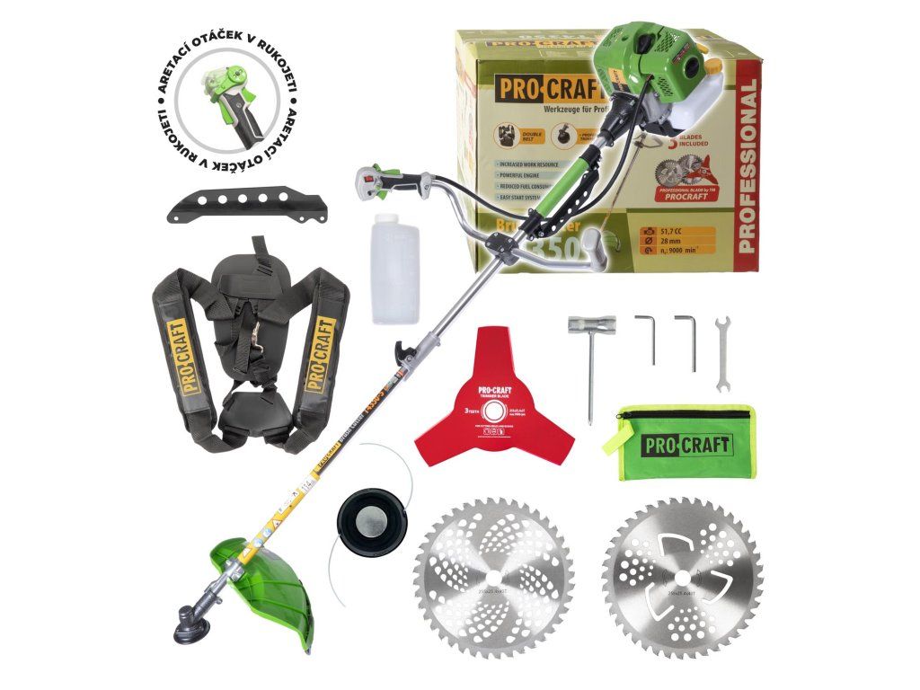 Benzínový krovinorez Procraft TP4350 je určený na kosenie a vyžínanie trávnatých plôch, odstraňovanie drevnatého porastu do hrúbky 2 cm. Výkonný dvojtaktný motor s objemom 52 cm3 a 9000 otáčkami za minútu zaručuje dlhú bezproblémovú prevádzku a vysoký výkon. Ovládanie vyhadzovania struny je poloautomatické. Súčasťou dodávky je 1x bežecká hlava, 2x pílový kotúč na drevo, 3. zubový kotúč, ochranná maska, rezná struna, nádoba na palivovú zmes, dvojramenný popruh a sada kľúčov. Priemer lišty 28 mm a 9,hviezdicová os v zaručujú dlhšiu životnosť prevodovky. Predpísaná zmes oleja a benzínu je 1:40 (1:25 pri zábehu) Kartónové balenie.