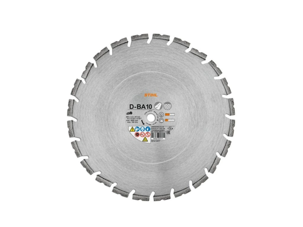 Diamantový rezný kotúč D-BA10 je vhodný najmä na asfalt, čerstvý betón a betón, ako aj na pieskovec a tehly . Diamantový rezací kotúč STIHL D-BA10 s priemerom 350 mm je možné použiť s nasledujúcimi rozbrušovacími pílami:- STIHL TS 420