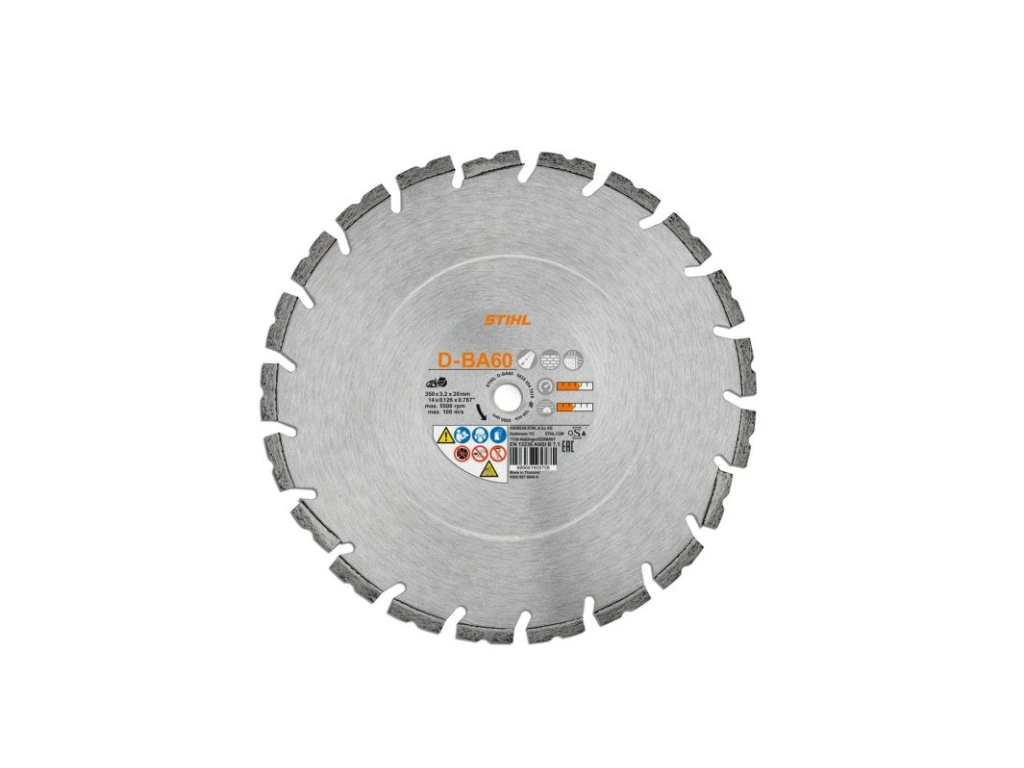 Veľmi rýchly diamantový rezný kotúč D-BA60 je vhodný ako univerzálny rezný kotúč na rôzne materiály: asfalt, pieskovec a tehly, čerstvý betón a betón . Diamantový rezací kotúč STIHL D-BA60 s priemerom 300 mm je možné použiť s nasledujúcimi rozbrušovacími pílami:- STIHL TS 410