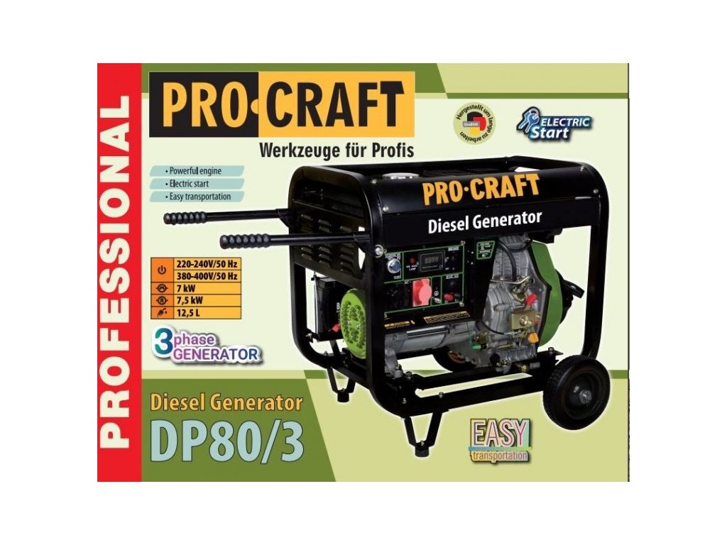 Dieselový generátor Procraft DP80/3 je určený na použitie ako nezávislý generátor elektrickej energie pri výpadku prúdu, ako zdroj energie v stavebníctve, v domácnosti, kde nie je k dispozícii elektrická sieť. Výhodou je nižšia spotreba paliva a dlhšie používanie ako pri benzínových elektrocentrálach. Vďaka vysokému výkonu umožňuje napájať nielen domáce spotrebiče, ale aj spotrebiče indukčného typu. Elektrocentrála má palivovú nádrž s objemom 12,5 l, čo zaručuje dlhú nepretržitú prevádzku. Elektronický štart zabezpečuje rýchle naštartovanie benzínového motora. Robustný ochranný rám umožňuje používanie generátora elektrickej energie v akýchkoľvek podmienkach a uľahčuje aj jeho prepravu. Súčasťou dodávky je elektrická sviečka, kľúč na zapaľovacie sviečky. Balenie v kartóne.