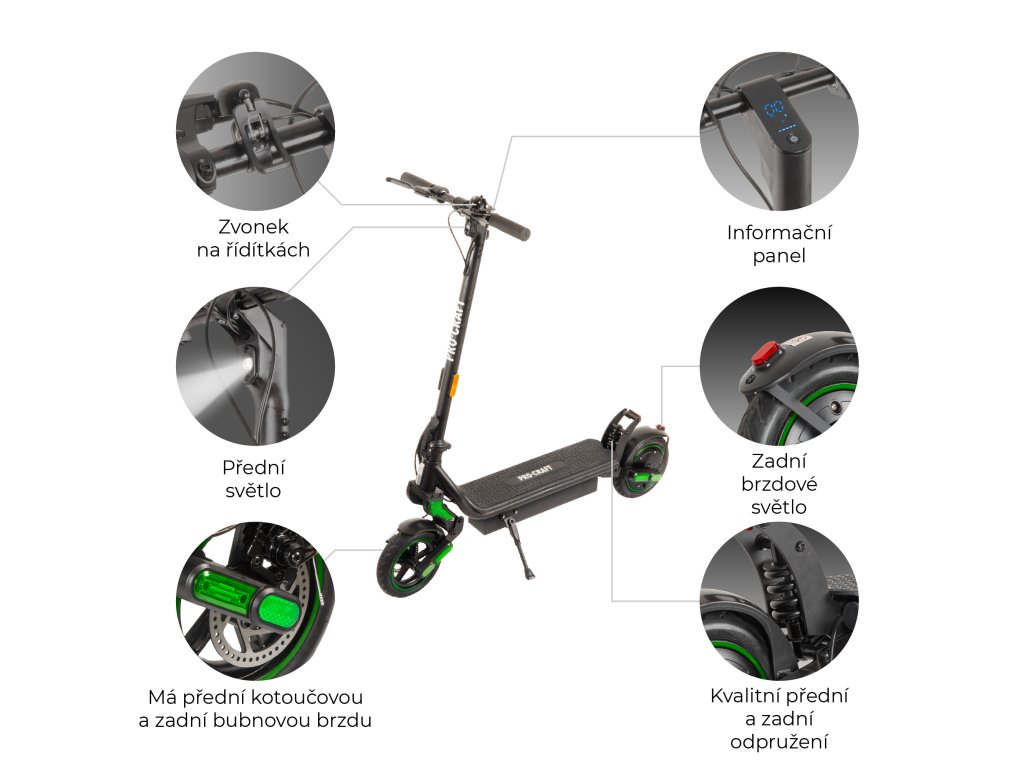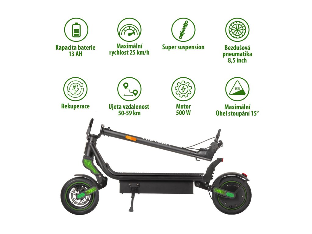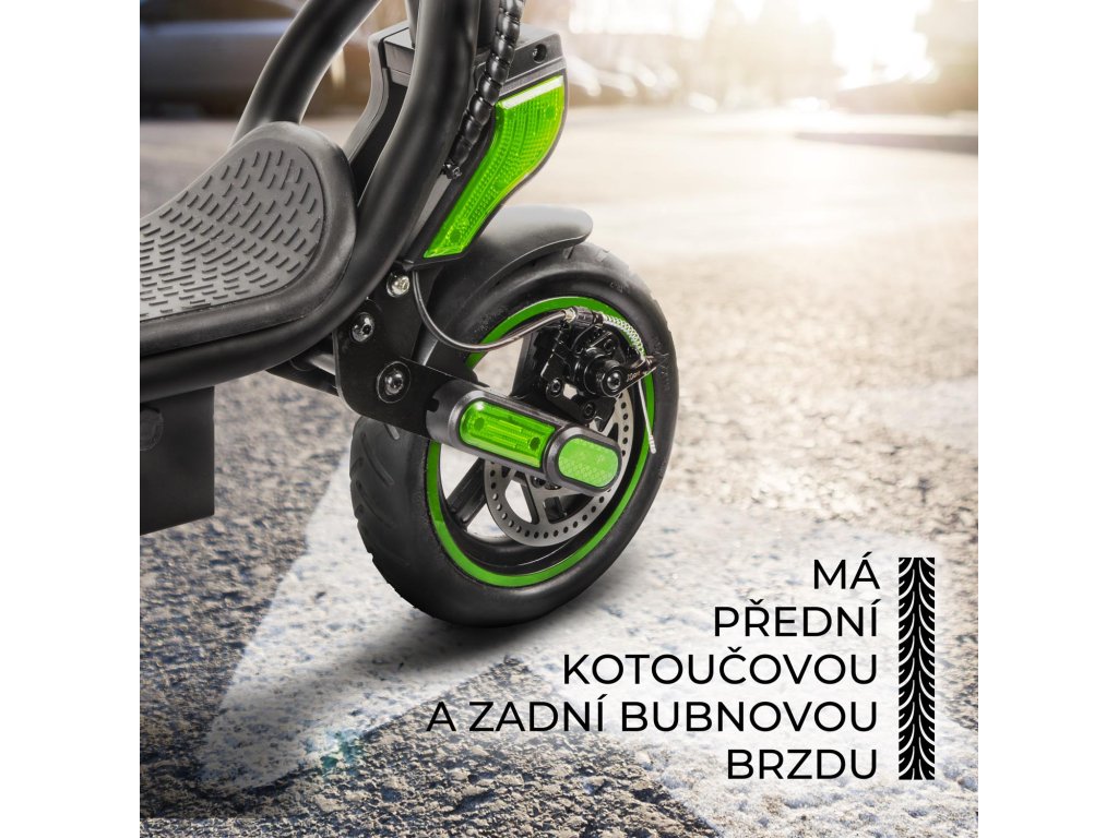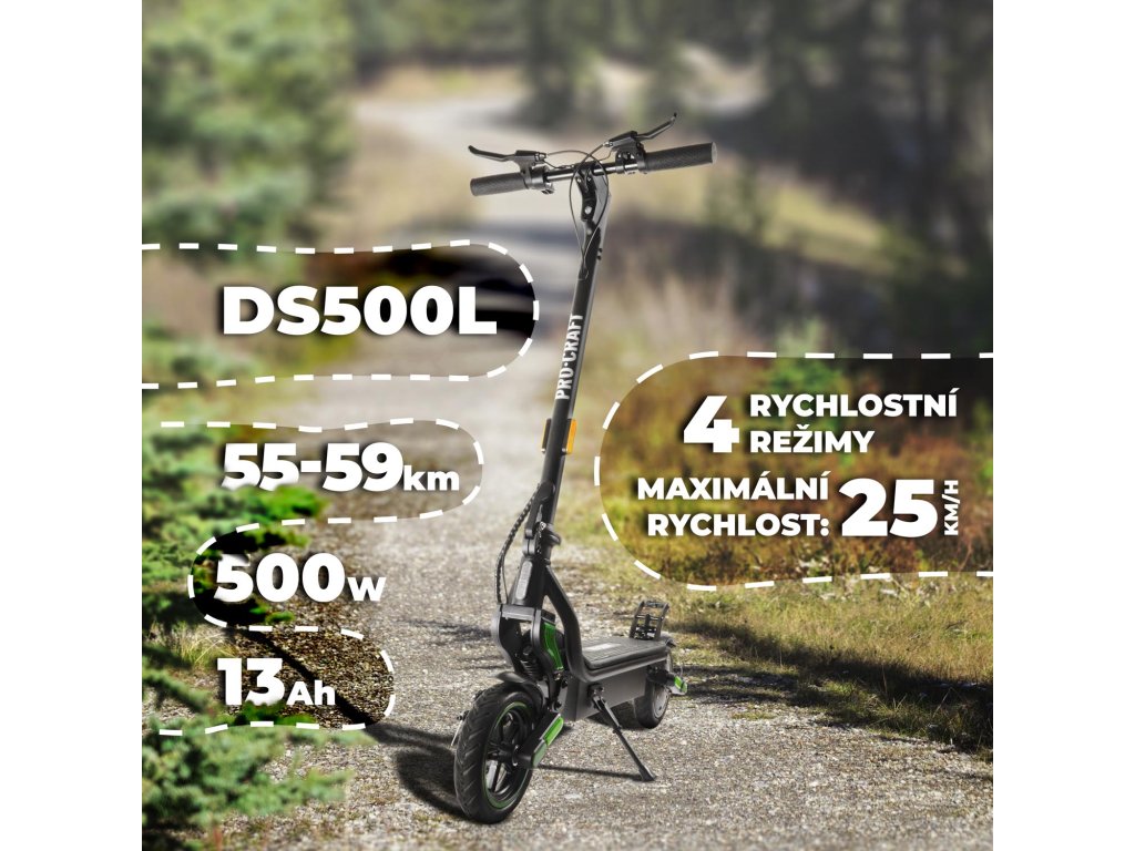 Model DS500L je vybavený výkonným 500W motorom, ktorý dosahuje maximálnu rýchlosť 25 km/h a umožňuje plynulú jazdu aj v náročnejších podmienkach. O bezpečné zastavenie sa stará predná kotúčová a zadná bubnová brzda, ktoré poskytujú silný brzdný účinok a maximálnu kontrolu nad jazdou.