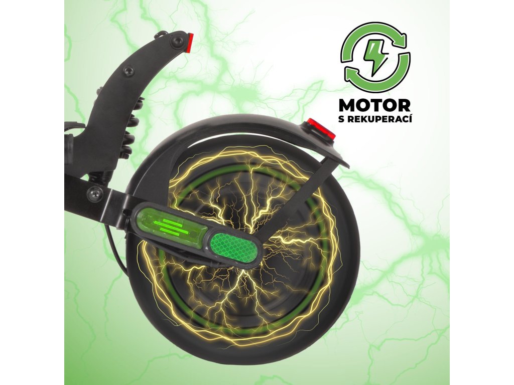 Kolobežka je vybavená 48V 13 000 mAh batériou, ktorá v kombinácii s rekuperačným brzdovým systémom a funkciou tempomatu zabezpečuje efektívnu a pohodlnú prevádzku. Rekuperácia pri spomaľovaní vracia časť energie späť do batérie, zatiaľ čo tempomat pomáha udržať konštantnú rýchlosť bez nutnosti neustáleho pridávania plynu. Vďaka tomu dosahuje dojazd až 59 km na jedno nabitie. Plné nabitie trvá približne 6 hodín.
