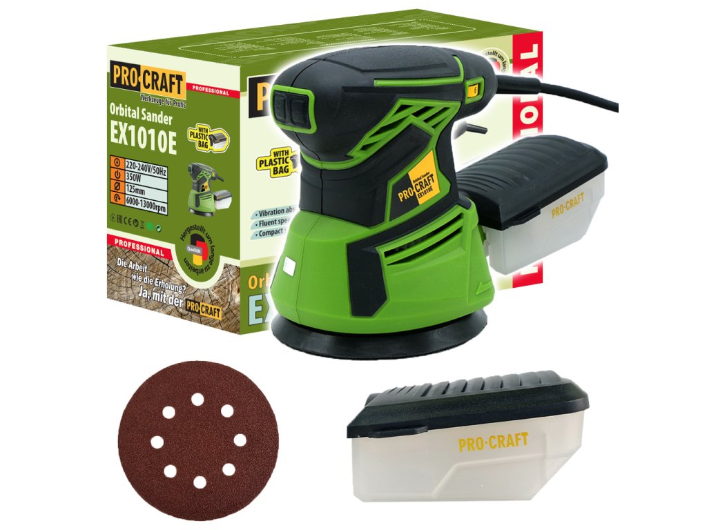 Bruska Procraft EX1010E je určená na brúsenie dreva, kovu a plastov. Upínanie na suchý zips umožňuje rýchlu výmenu brúsneho papiera. Vysoký pracovný výkon umožňuje brúsna hlava s priemerom 125 mm a výkonný 350W motor. Pomocou regulátora otáčok možno nastaviť optimálne otáčky pre všetky materiály v rozmedzí 6000-13500 ot/min. Rukoväť s pogumovaným povrchom umožňuje dlhodobé používanie náradia. Funkcia odsávania zabezpečuje čisté pracovné prostredie. Kartónové balenie.