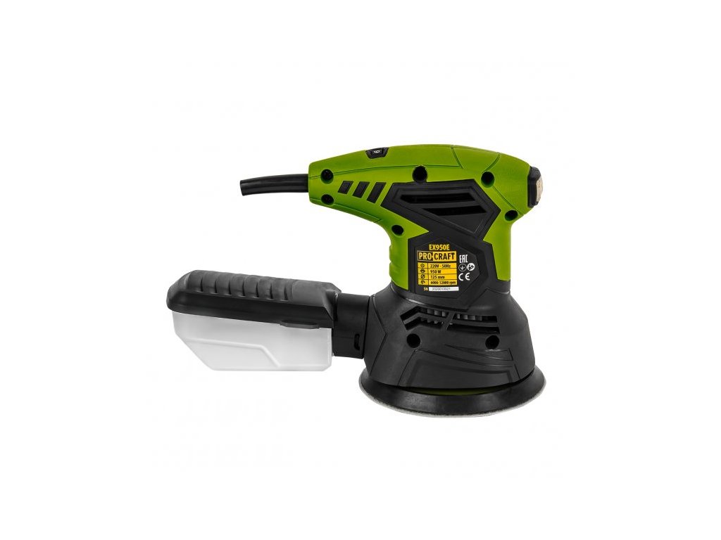 Procraft EX950E je určený na brúsenie dreva, kovu a plastov. Uzáver na suchý zips umožňuje rýchlu výmenu brúsneho papiera. Vysoký pracovný výkon umožňuje brúsna hlava s priemerom 125 mm a výkonný 240W motor. Pomocou regulátora otáčok možno nastaviť optimálne otáčky pre všetky materiály v rozmedzí 6000-12000 ot/min. Rukoväť s pogumovaným povrchom umožňuje dlhodobé používanie náradia. Funkcia odsávania zabezpečuje čisté pracovné prostredie. Súčasťou dodávky je brúsny papier so zrnitosťou od P80 a vrecko na prach. Kartónové balenie.