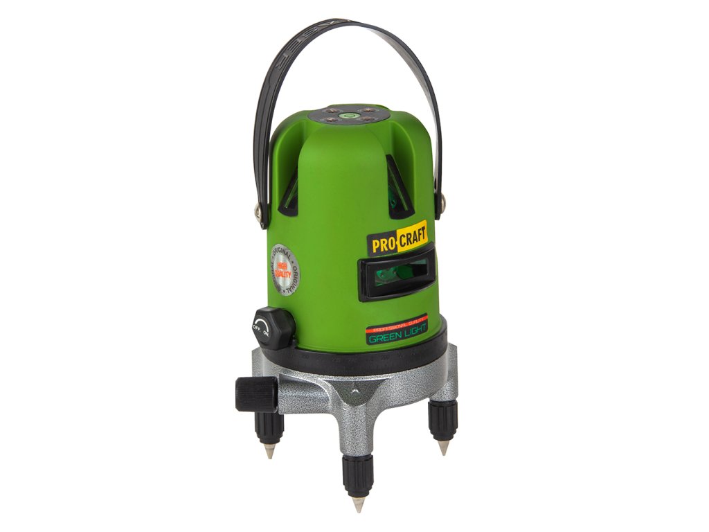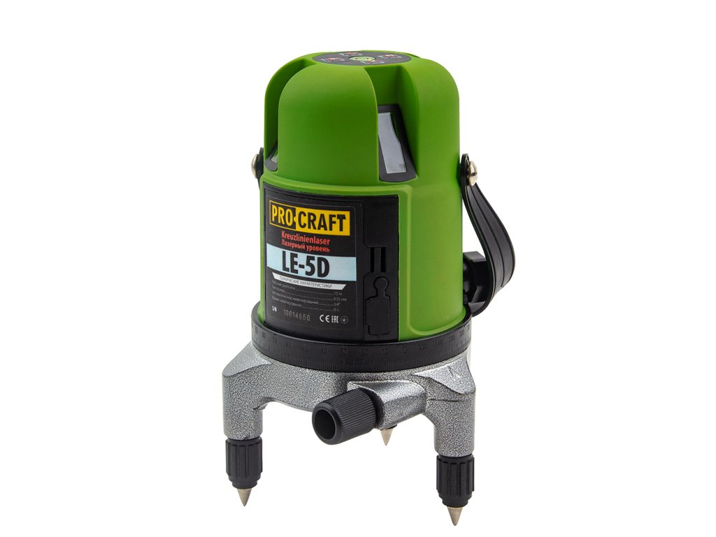Zelený čiarový laser Procraft LE-5D je určený na určovanie vertikálnych a horizontálnych čiar v interiéri. Zelená čiara lasera zabezpečuje lepšiu viditeľnosť na dennom svetle. Možno ho nainštalovať na statív s 5/8" závitom. Univerzálne napájanie priamo z elektrickej siete, pomocou 1,5 V batérie typu AA alebo dodávaného akumulátora. Automatické samonivelizovanie v rozsahu ±3° uľahčuje a urýchľuje prácu. Obsahuje batériu, ochranné puzdro, laserové okuliare a napájací adaptér. Kartónové balenie.