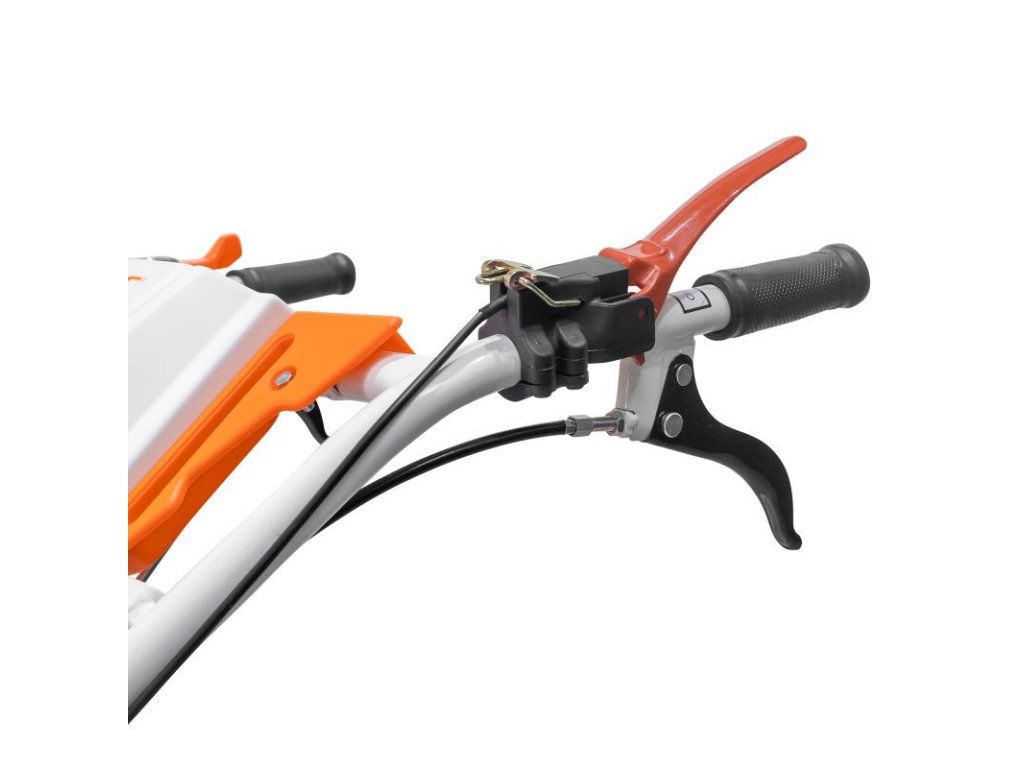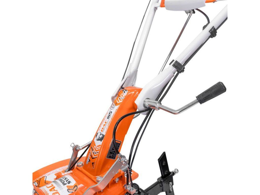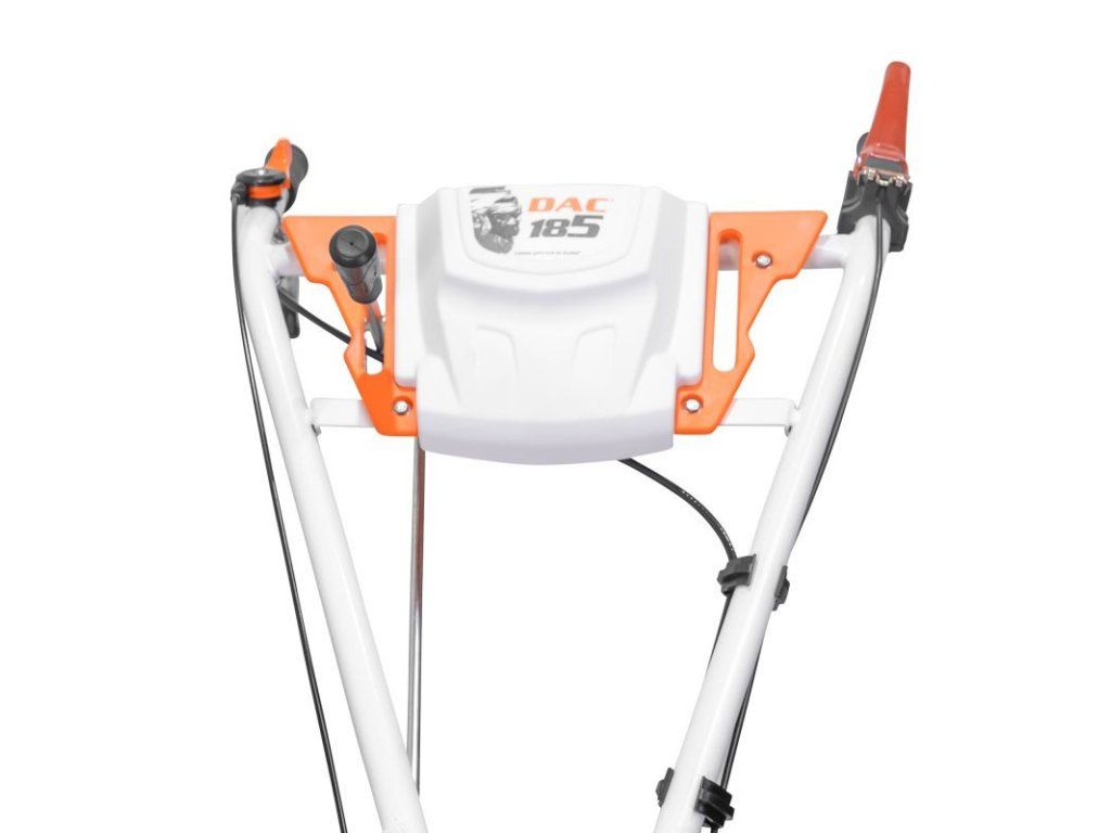 Motorový kultivátor DAC 185 je vybavený pákou núdzového zastavenia, ktorá umožňuje okamžité vypnutie motora v prípade potreby. Robustná konštrukcia a vyvážené rozloženie hmotnosti zabezpečujú stabilitu počas práce a komfortnú manipuláciu.
