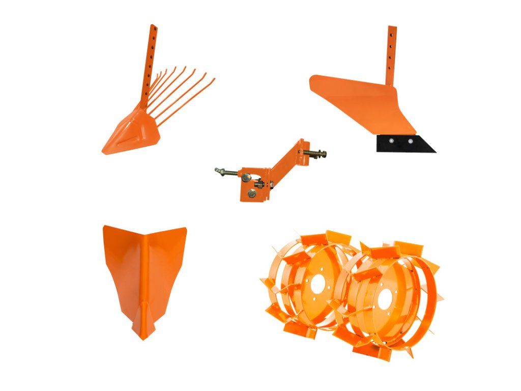 Obsah setu: orebné kolesá 400 bez poloosí, vyorávač na zemiaky, jednostranný pluh, hrobkovací pluh na brzdu kultivátora, adaptér na náradie