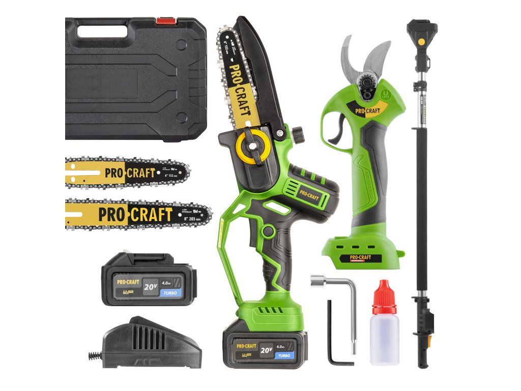Sada Procraft PKA32Li + ES28Li + EP2.0R obsahuje aku reťazovú pílu, aku nožnice na vetvy a predlžovací nadstavec – ideálne riešenie pre pohodlnú údržbu záhrady vo výškach, bez rebríka a bez námahy. Kompatibilná s 20V batériovým systémom Procraft.