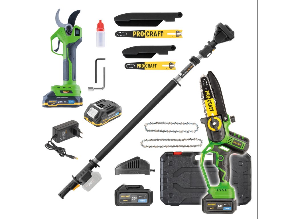 Sada Procraft PKA32Li + ES32Li + EP2.0R obsahuje aku reťazovú pílku, aku nožnice na konáre a predlžovací nadstavec. Náradie je vybavené bezuhlíkovým motorom a ponúka vysoký výkon. Balenie obsahuje: 2× batériu (20 V 4 Ah a 20 V 2 Ah), 2× kufor, 2× lištu a 2× reťaz.