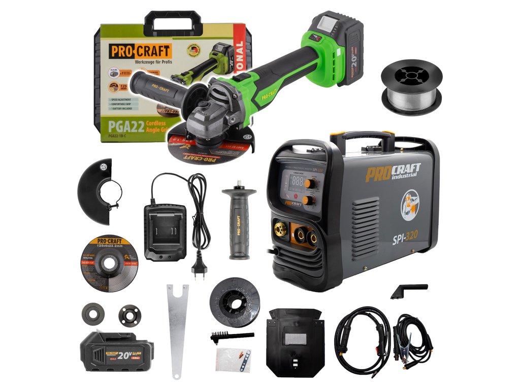 Kompletná profesionálna sada určená na zváranie aj následnú úpravu materiálu. Výkonný poloautomatický invertor SPI-320, bezuhlíková aku uhlová brúska PGA22 a trubičkový FLUX drôt FW81 tvoria ideálnu kombináciu pre dielňu, stavbu aj montážne práce. Sada je pripravená na okamžité použitie.