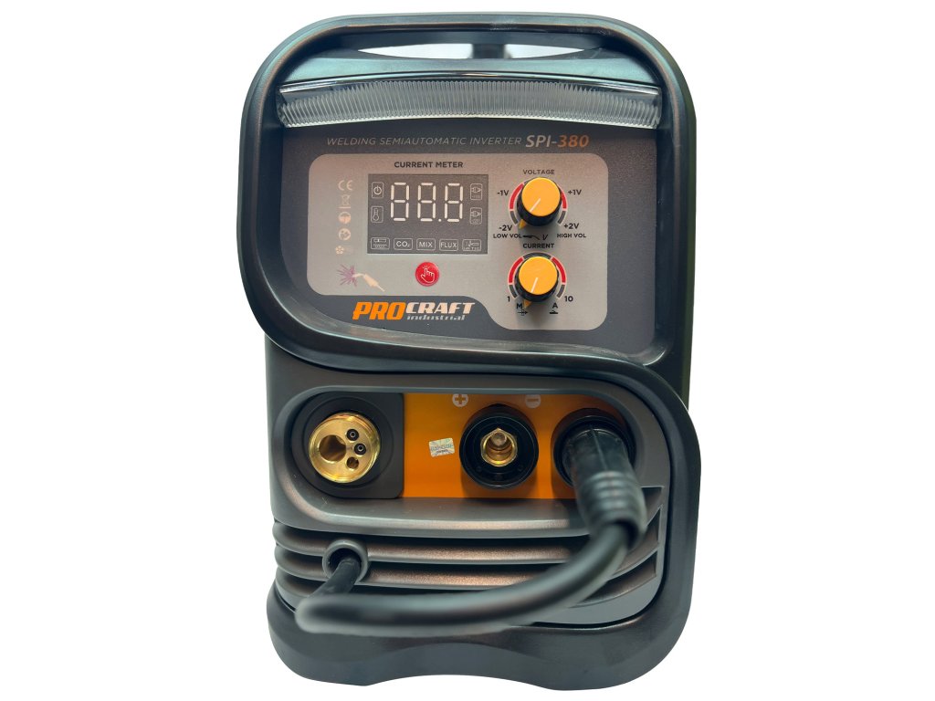 Zvárací invertor Procraft SPI-380 je určený na ručné zváranie metódami MMA, MIG a MAG. Výkonové tranzistory IGBT zaručujú dlhú bezporuchovú prevádzku. Regulácia zváracieho prúdu v rozsahu 20-180 A umožňuje nastaviť optimálne parametre pri práci s rôznymi kovmi. Možno použiť zvárací drôt s priemerom 0,6 až 1,0 mm. umožňuje zváranie inertnými alebo aktívnymi plynmi. Na LCD displeji sa zobrazuje aktuálny zvárací prúd. Súčasťou dodávky je zvárací drôt 0,8 mm (bubon s hmotnosťou 5 kg), horák MIG s káblom, zvárací štít, kábel s držiakom elektród, kábel s uzemňovacími kliešťami a drôtená kefa v kombinácii so struskovým kladivom. Balenie v kartóne.